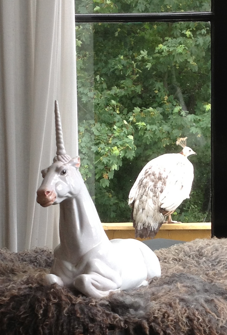 Inmiddels is Mijn Architect ook aangeschoven voor koffie en daarna gaan we het huis in. Net als de vorige keer ben ik weer even verbaasd. Dat interieur, al die (tuin)boeken, kunstvoorwerpen, muurschilderingen … je loopt hier bijna met open mond rond.